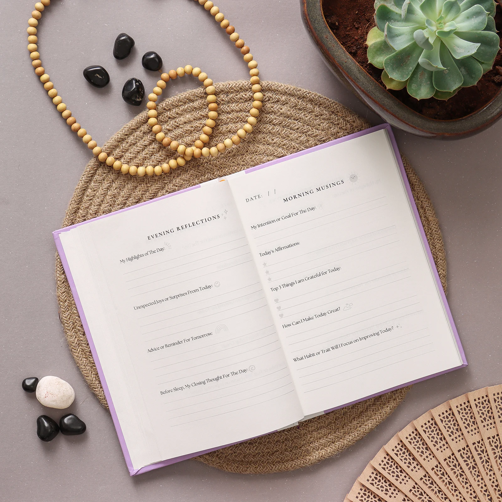 1. Morning Musings: Begin your day with intention and gratitude using our Morning Musings section. Set a positive intention or goal, crafting affirmations to uplift your mindset and set the tone for the day. Express gratitude by listing three things you’re thankful for, no matter how small, and contemplate actionable steps to make today great. Reflect on a habit or trait you wish to improve, fostering personal growth and self-awareness.