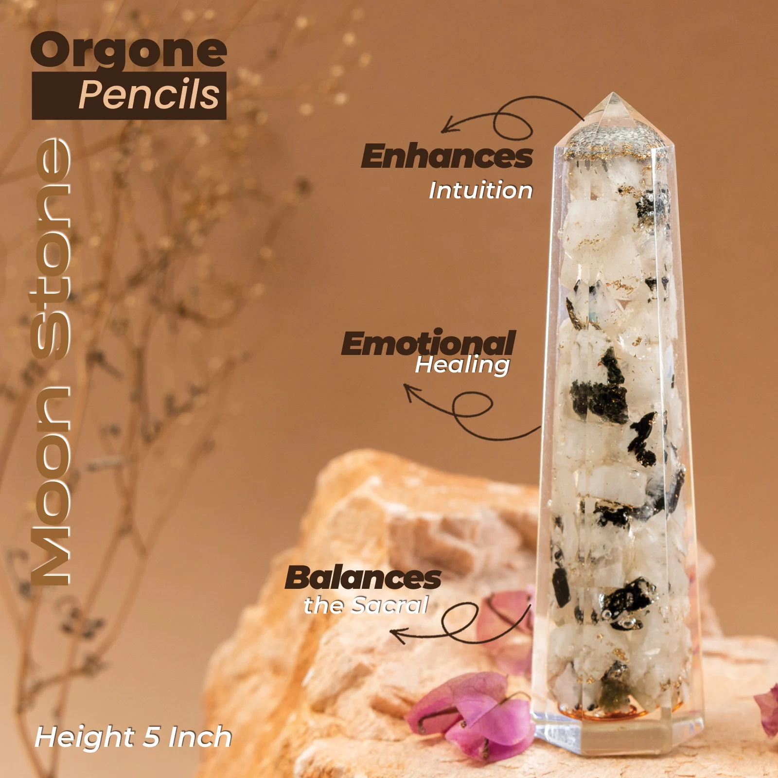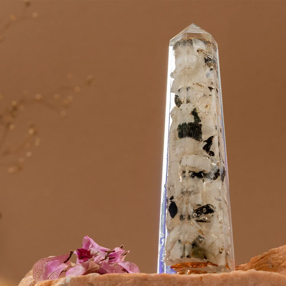 - Crafted with Moonstone and Orgonite, this pencil-shaped tower serves as a powerful tool for energy amplification and transformation, providing holistic benefits for mind, body, and spirit.